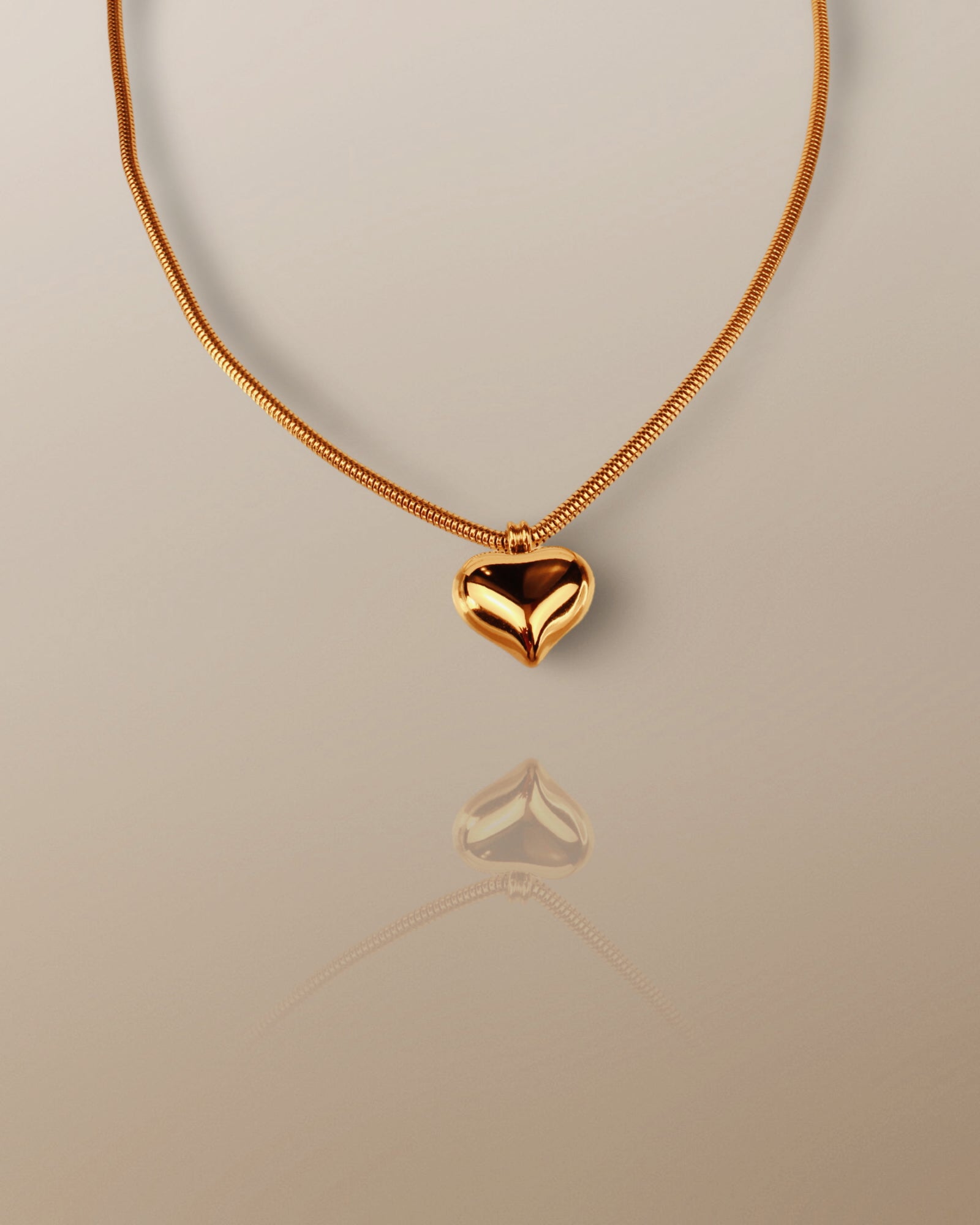 Experience effortless luxury with the Gilded Heart Necklace. Its softly sculpted 18K gold heart pendant, crafted over durable 316L stainless steel, is a timeless expression of love. The sleek snake chain drapes gracefully, and the magnetic clasp adds a touch of modern ease, ensuring lasting appeal.